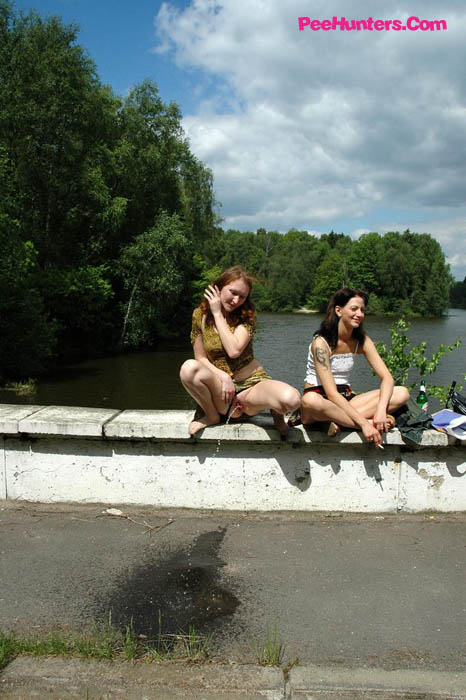 Three teen whores pissing off the old bridge